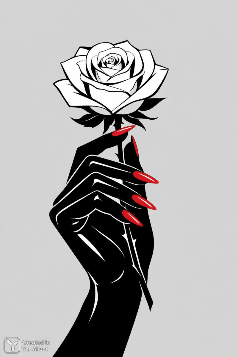 hand in black glove with long red nails, gently holding a white rose, elegant minimalist design, soft gray background, vector style, high contrast, artistic lines.