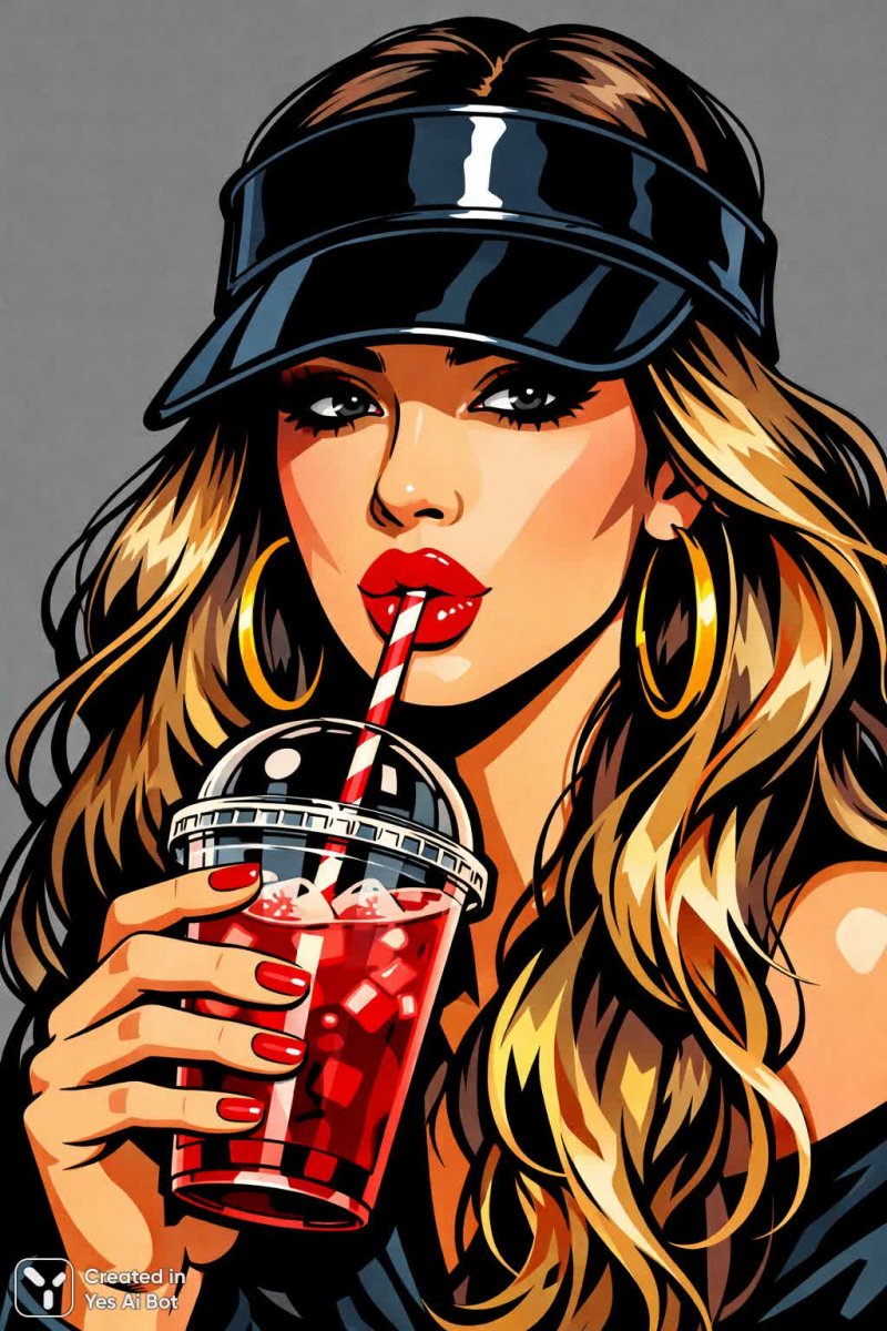 Яркий портрет девушки в стиле поп-арт привлекает внимание своей смелостью и контрастом. Длинные волнистые волосы обрамляют лицо с выразительной мимикой, подчеркнутой сочными красными губами и аккуратным маникюром. Черный козырек добавляет образу дерзости и загадочности, а легкий напиток, поглощаемый через трубочку, создает ощущение непринужденности и летней свежести. Гладкие, насыщенные цвета в сочетании с динамичной композицией передают энергию и позитив. Акцент сделан на выражении лица модели, которое словно запечатлевает момент удивления или легкой улыбки. Нейтральный серый фон позволяет выделить яркую героиню и не отвлекать внимание от основных деталей портрета. Вся работа выполнена в технике, характерной для поп-арта, с использованием четких линий и насыщенных тонов, что создает эффект визуальной привлекательности и запоминаемости. Это произведение искусства – настоящий взрыв цвета и эмоций, способный украсить любое пространство и подарить хорошее настроение. Изображение обладает особой динамикой и передает ощущение молодости и свободы, при этом сохраняя изысканность и элегантность благодаря тщательному подбору цветов и деталей. Кажется, будто девушка оживает прямо перед зрителем, приглашая разделить с ней мгновение радости и наслаждения жизнью