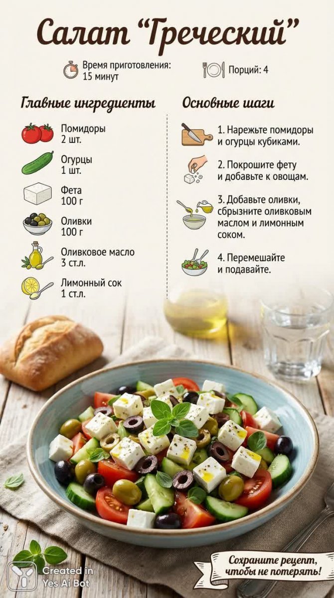 Освежающий и легкий салат 'Греческий' – идеальное блюдо для летнего обеда или ужина. Всего за 15 минут вы сможете приготовить вкусную и полезную закуску из простых ингредиентов: сочных помидоров, хрустящих огурцов, нежной феты, ароматных оливок, сдобренную душистым оливковым маслом и ярким лимонным соком. Этот салат – настоящий кладезь витаминов и микроэлементов, который подарит вам заряд энергии и хорошее настроение. Следуйте простым шагам: нарежьте овощи кубиками, добавьте фету, оливки, заправьте маслом и соком. Подавайте сразу же, наслаждаясь неповторимым вкусом Средиземноморья. Яркое фото демонстрирует аппетитный салат в светлом салатнике, украшенный свежими зелеными листьями на фоне уютного деревянного стола, залитого мягким светом – настоящее произведение кулинарного искусства! Не забудьте сохранить этот простой и вкусный рецепт, чтобы всегда иметь под рукой способ приготовить идеальный греческий салат. Этот рецепт станет вашим верным помощником в создании быстрых и полезных блюд для всей семьи