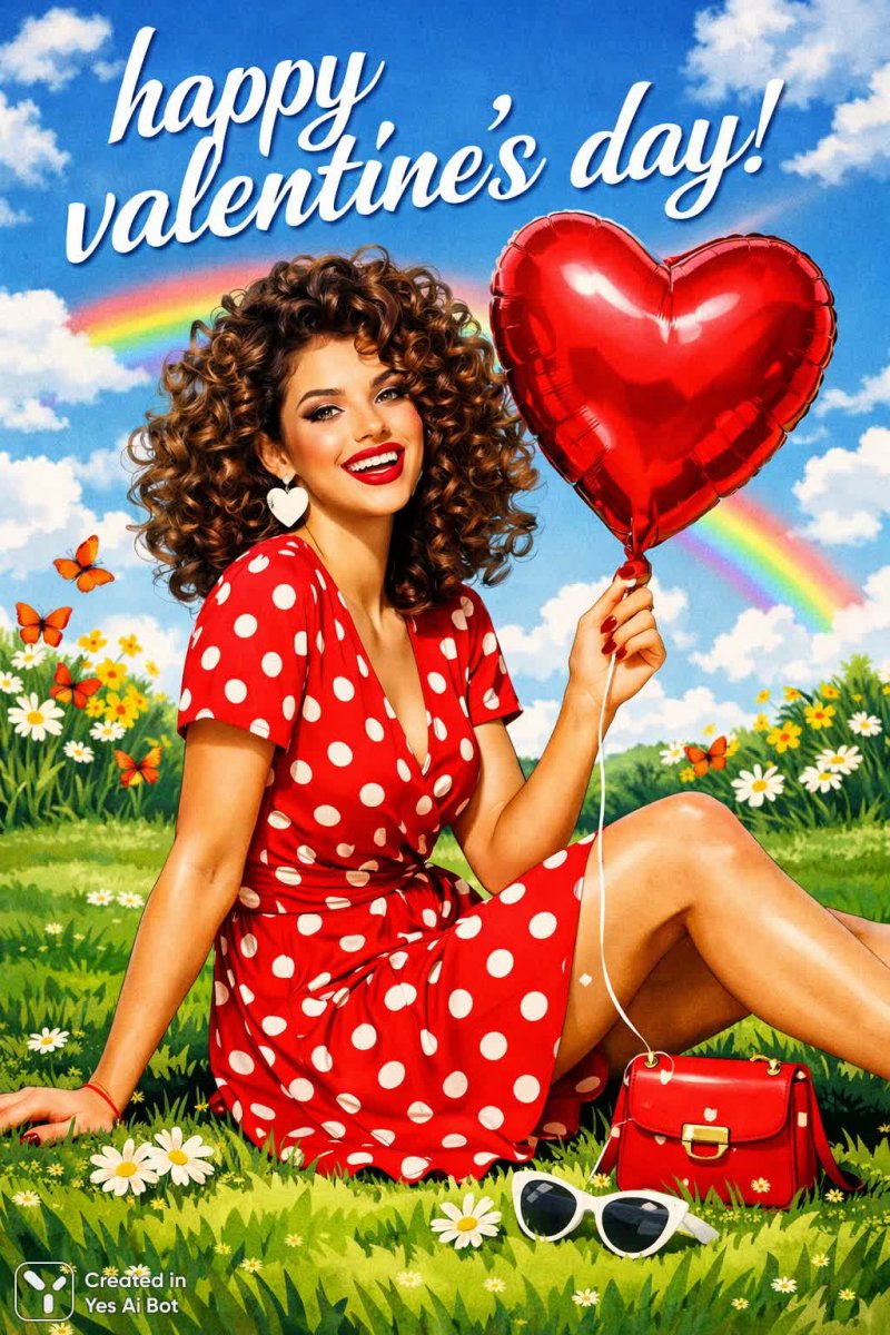4. girl with curly hair, dressed in red dress with white polka dots, sitting on grass with a heart-shaped balloon, bright red lips, cheerful pose, colorful scene, graphic style, joyful illustration, text: "happy valentine’s day".