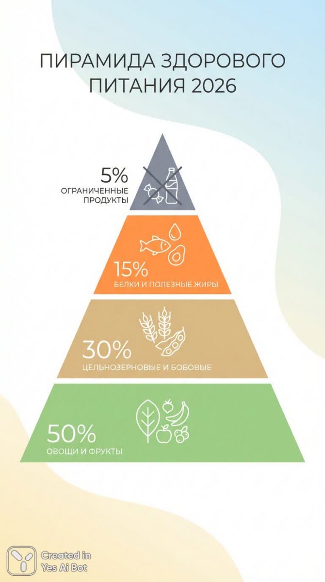 Современная инфографика представляет собой стилизованную пирамиду здорового питания, разработанную на 2026 год. Она визуально демонстрирует оптимальное соотношение продуктов для сбалансированного рациона, используя минималистичный дизайн и понятные символы. Пирамида состоит из четырех горизонтальных слоев, каждый из которых отражает определенную группу продуктов и их процентное содержание в ежедневном рационе. В основании пирамиды – овощи и фрукты (50%), занимающие самую большую часть, что подчеркивает их важность для здоровья. Следующий слой включает цельнозерновые продукты и бобовые (30%), обеспечивающие организм необходимыми клетчатками и энергией. Третий уровень представлен белками и полезными жирами (15%), которые являются строительными блоками организма и поддерживают его функции. На вершине пирамиды – ограниченные продукты (5%), употребление которых следует минимизировать из-за их потенциального негативного воздействия на здоровье. Каждый слой четко обозначен процентным соотношением, а внутри расположены лаконичные иконки: лист для овощей и фруктов, колос пшеницы для злаков, рыба для белков и перечеркнутая конфета для ограниченных продуктов. Фон выполнен в виде нежного градиента, что добавляет визуальной привлекательности, а современный шрифт без засечек обеспечивает легкость восприятия информации. Пространство между элементами продумано таким образом, чтобы инфографика выглядела чистой и организованной, способствуя лучшему пониманию принципов здорового питания. Стиль дизайна – плоский (flat design), что придает изображению современный и лаконичный вид