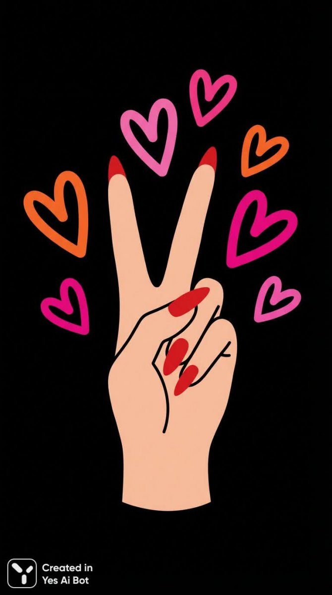 hand with long red nails mimicking peace sign, surrounded by floating hearts, simplistic vector art, vivid colors, black background, modern design, minimalistic approach.