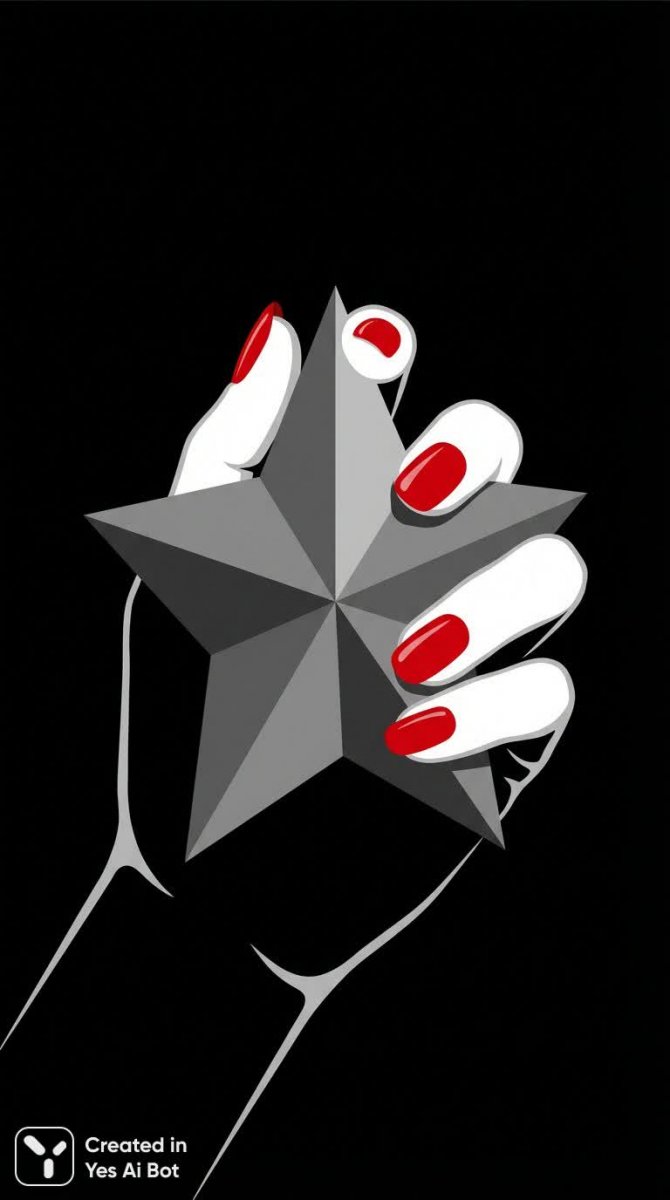 Изящная композиция, где акцент сделан на контрасте и минимализме. На фоне глубокого черного цвета, изящная женская рука с ярко-красными ногтями бережно удерживает серую звездообразную фигуру. Четкие, элегантные линии создают ощущение современности и утонченности, свойственное современной графике. Использование векторной иллюстрации обеспечивает четкость и детализацию изображения, подчеркивая геометрическую форму звезды. Высокий контраст между ярким красным цветом ногтей и нейтральным серым оттенком звездочки привлекает внимание зрителя к центральному элементу композиции. Стиль работы выполнен в духе минимализма, что позволяет передать суть образа с максимальной лаконичностью и изысканностью. Общий эффект – это элегантное сочетание формы и цвета, создающее визуально приятное и запоминающееся изображение, идеальное для использования в современном дизайне. Простота исполнения не умаляет его художественной ценности, а наоборот, подчеркивает мастерство художника, сумевшего передать сложное впечатление с помощью нескольких простых элементов. Эта работа демонстрирует гармоничное сочетание классической элегантности и современных графических трендов, что делает ее привлекательной для широкой аудитории