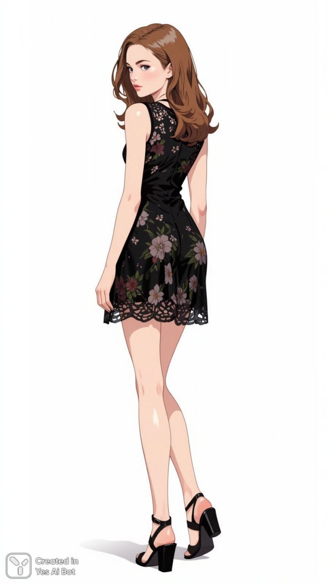 slender model with long legs, black lace dress with floral patterns, knee-length, strappy black sandals, light brown hair in soft waves, looking over shoulder, clean white background, detailed fashion painting, elegant style, gentle lighting.