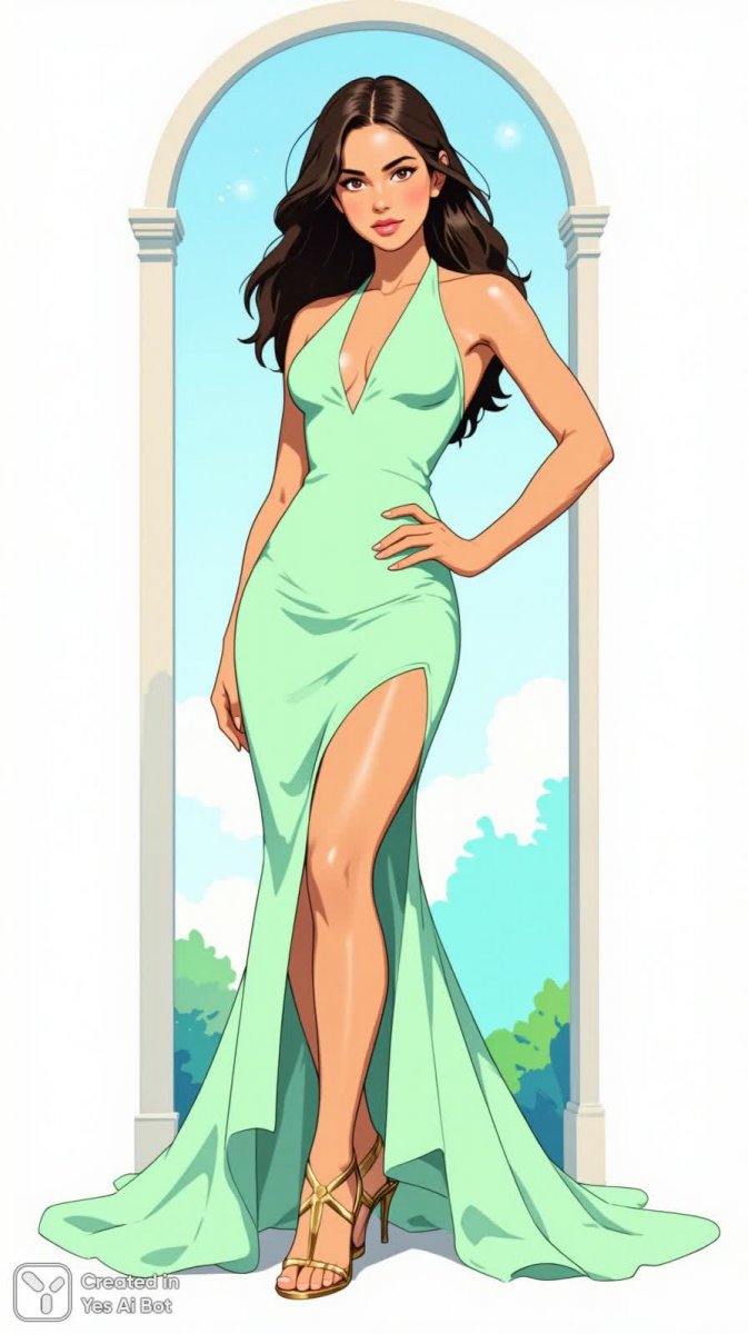 Элегантная и утонченная цифровая иллюстрация представляет собой современную модную съемку с акцентом на изысканный образ женщины. В центре внимания – модель в идеально сидящем мятно-зеленом платье с оригинальным вырезом халтер, подчеркивающим линию плеч и шеи. Высокий разрез на одной стороне платья добавляет образу динамичности и соблазнительности, а золотые туфли на тонких ремешках завершают стильный ансамбль. Длинные темные волосы свободно ниспадают по плечам, создавая ощущение легкости и естественности. Поза модели – уверенная и грациозная: одна рука покоится на бедре, что подчеркивает ее достоинство и непринужденность. Фон выполнен в минималистичном стиле, с использованием ярких, но не отвлекающих цветов, чтобы акцентировать внимание на красоте модели и деталях ее одежды. Мягкое световое освещение создает атмосферу тепла и уюта, делая изображение особенно привлекательным. Высочайшее качество исполнения деталей и реалистичность передачи текстур демонстрируют профессионализм художника и делают эту иллюстрацию настоящим произведением искусства, идеально подходящим для модных журналов или рекламных кампаний, стремящихся к современному и элегантному стилю. Это визуальное воплощение изысканности и стиля, отражающее последние тенденции в мире высокой моды и предлагающее зрителю почувствовать атмосферу роскоши и безупречного вкуса