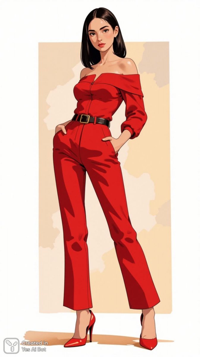 young woman posing in a fitted red jumpsuit with off-the-shoulder neckline, long sleeves, sleek straight hair, vibrant red high heels, standing confidently, minimalist backdrop, fashion illustration style, soft studio lighting, eye-level shot.