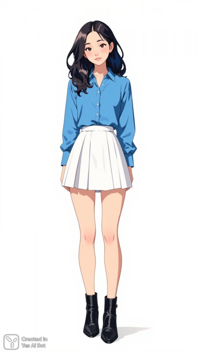 4. modern fashion illustration of a girl, fitted blue blouse, pleated white mini skirt, black ankle boots, long dark hair in loose waves, playful expression, standing with one leg bent, simple white BG, soft bright lighting.