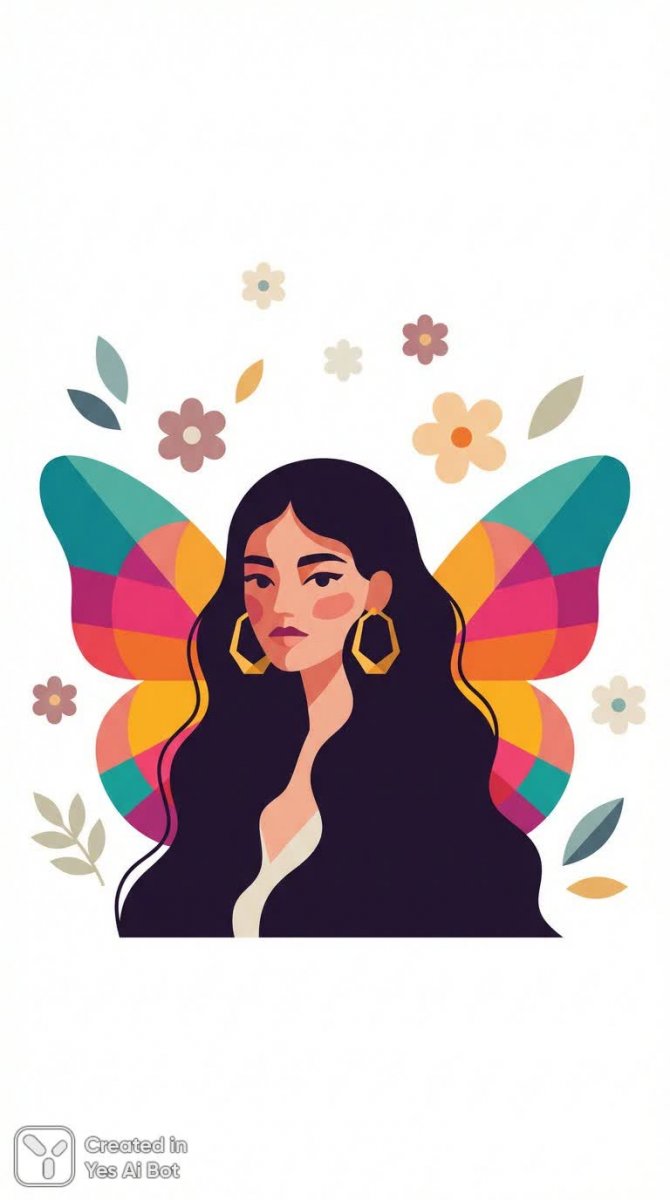 5. long-haired girl with colorful butterfly wings, wearing oversized golden hoop earrings, abstract expressions, minimalist flowers around, flat shapes, ultramodern look, digital illustration, white BG.