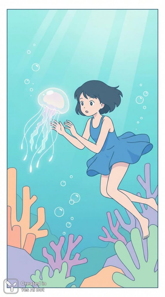 1girl, 1jellyfish, (underwater scene) 🌊🐠, (girl swimming gracefully) 🧜♀️💦, (soft glowing jellyfish) 🌌✨, (colorful coral reef) 🐚🌈, (curious expression) :o, (bubbles surrounding) 💧🫧, (ethereal light filtering through water) ☀️, (feeling a magical connection) ❤️💫, (tranquil atmosphere) 🧘♀️🌊, (embracing the underwater beauty) ^_^💖.