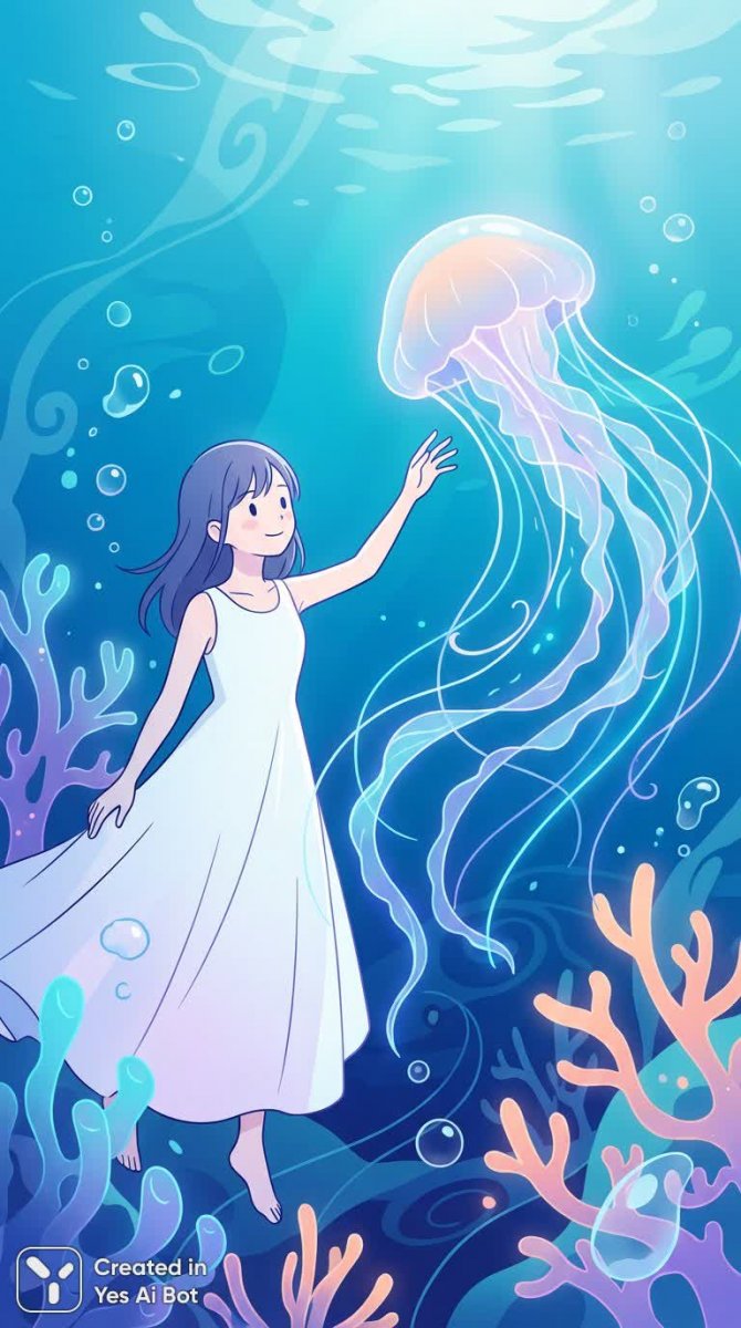 Завораживающая сцена в сюрреалистичном подводном мире, где юная девушка нежно тянется к изящно танцующему медузе. Яркие краски создают атмосферу волшебства и чудес, а мягкий свет подчеркивает красоту момента. В глубинах таинственного океана происходит удивительная встреча, наполненная ощущением восторга и нежной связи с обитателями морских глубин. Девушка и медуза словно заворожены друг другом, в их движении чувствуется гармония и легкость. Кажется, будто они вместе танцуют в мерцающем свете, погружаясь в безграничные просторы подводного царства. Это мгновение – воплощение красоты, таинственности и магии, пробуждающее в душе чувство умиротворения и восхищения перед великолепием природы. Подводный мир предстает как сказочное пространство, где реальность переплетается с фантазией, а каждый элемент создает неповторимую атмосферу волшебства и безмятежности. Эта картина – гимн красоте морской жизни и гармонии человека с природой, приглашающий зрителя в мир грез и чудес