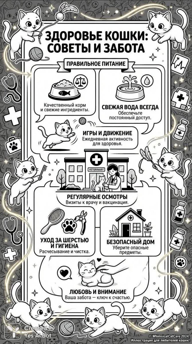 Советы ветеринара для кошек: красочная инфографика о здоровье питомцев - Пример изображения, сгенерированного нейросетью NanoBanana