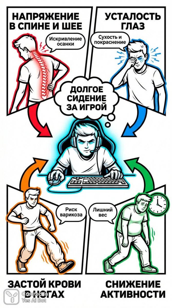 1. show an engaging infographic in russian about the causes of hemorrhoids from prolonged computer sitting during gaming, incorporating dynamic characters in action poses, bold modern text, strong black outline, white fill, high contrast, vivid colors.