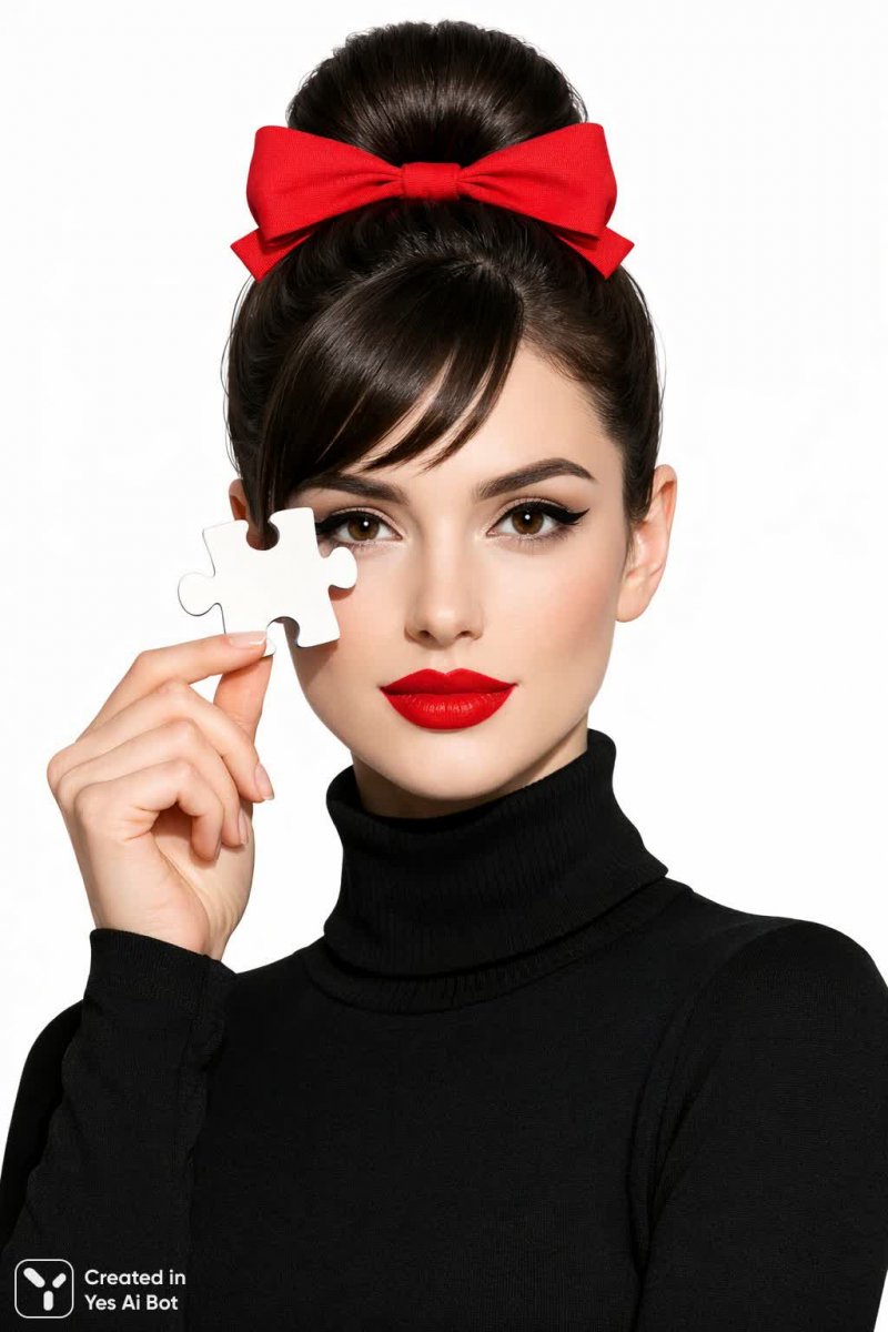 5. girl with high bun hairstyle, red bow and bright red lipstick, holding a puzzle piece near face, black turtleneck, clean lines and modern aesthetic, white BG, graphic focus, minimalism.