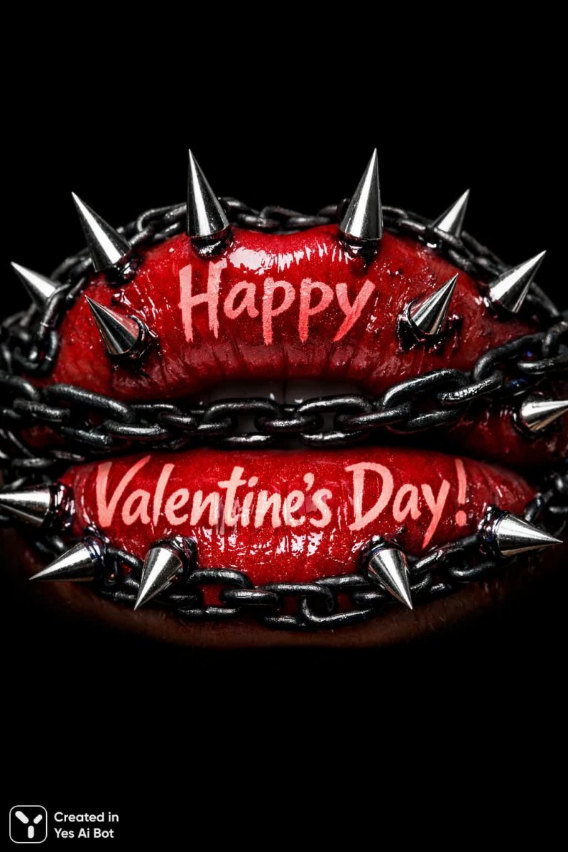 5. lips with red leather text on them, covered in spikes, black chains, realistic texture, macro shot, minimalistic style, Happy Valentine’s Day!