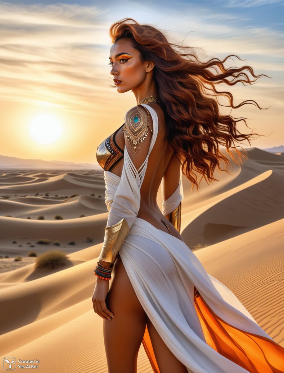 3. A biomechanical Gaia, side angle, meditative pose, weathered brown skin, fiery orange eyes, wavy chestnut hair, long hair down style, lean physique, draped garments, (desert landscape:1.3), (sandy dunes:1.2), (tribal art:1.4), (golden hour:1.1), (watercolor:1.3), (mythological illustrations:1.5), (by Salvador Dalí:1.1), 32K