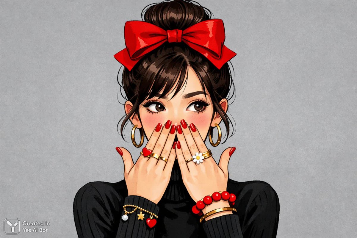5. girl with high bun and bright red bow, wearing black turtleneck, fingers covering lips, illustration style, gray backdrop, playful mood, emphasis on accessories and color.