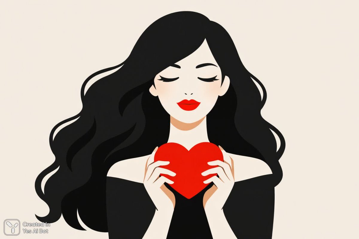 Нежная иллюстрация демонстрирует девушку с роскошными волнистыми волосами, чьи глаза ласково закрыты, а губы украшает яркая помада насыщенного красного оттенка. В руках она бережно держит предмет в форме сердца, символизирующий любовь и нежность. Изображение выполнено в минималистичном стиле с акцентом на гармоничное сочетание цветов и графическую четкость линий. Нейтральный фон позволяет выделить основную фигуру и подчеркнуть ее красоту и утонченность. Работа представляет собой пример качественного графического дизайна, где простота форм и цветовая палитра создают ощущение легкости и воздушности. Детализированная прорисовка волос и губ добавляет реалистичности, в то время как общий стиль остается лаконичным и элегантным. Изображение идеально подойдет для использования в качестве иллюстрации к романтическим произведениям или в дизайнерских проектах, требующих изящества и минимализма. Это визуальная ода красоте женственности и символическому выражению чувств, выполненная с использованием современных техник графического искусства. Каждая деталь тщательно продумана для создания гармоничного и запоминающегося образа