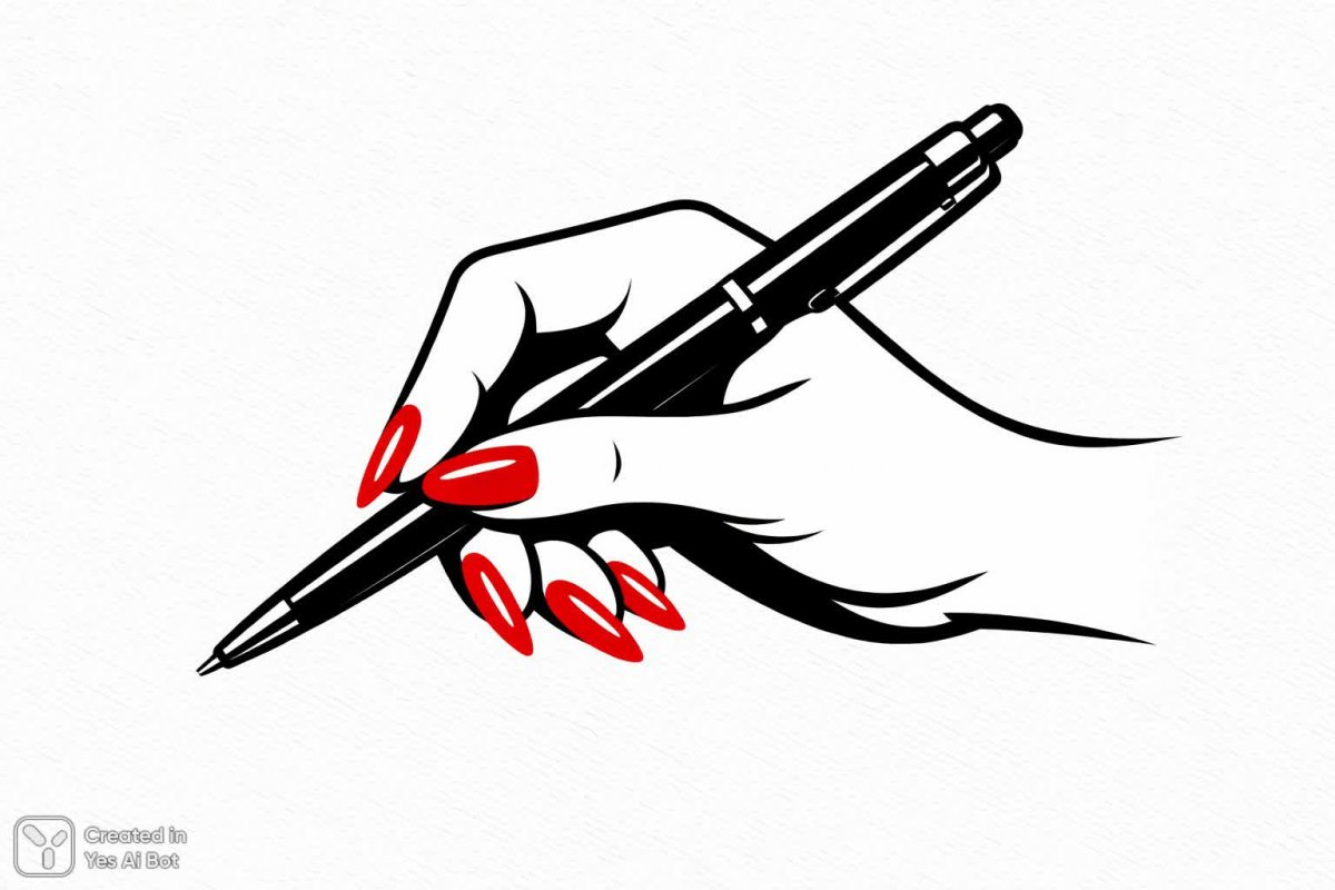 2. hand with long red nails holding a sleek black pen, elegant design, minimalist illustration, white textured background, vector art, clean lines, high contrast.