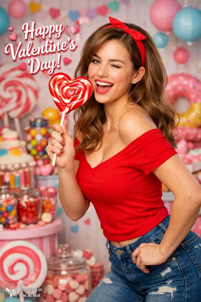 4. ultra high detail, woman in vibrant red crop top and high-waisted trousers, holding a giant heart-shaped lollipop, playful pose and expression, bright colorful studio environment filled with candy decorations, soft diffused lighting, cheerful atmosphere, "happy valentine’s day", camera: fuji gfx 100s, lens: gf 63mm f2.8 r, parameters: f/4, 1/80s, iso 250.