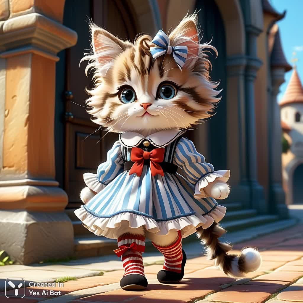 Очаровательный мультяшный котенок, воплощение пушистости и легкости. Его шерстка трепещет от дуновений ветра, подчеркивая игривые завитки и задорные полоски. Маленькая антропоморфная девочка-кошка с длинными тонкими ножками поражает своей милотой и необыкновенным стилем. Яркие детали одежды – модные наряды, забавные бантики и полосатые носочки – добавляют образу неповторимости. Широкий шаг придает котенку уверенности и динамичности, а в целом картина излучает позитив, юмор и трогательную нежность. Это настоящий праздник для глаз, наполненный детской непосредственностью и волшебством мультфильма. Его забавные повадки и прелестная внешность вызывают улыбку и дарят хорошее настроение. В этом образе гармонично сочетаются утонченная элегантность и беззаботная игривость, создавая незабываемый образ маленького модника, готового к приключениям