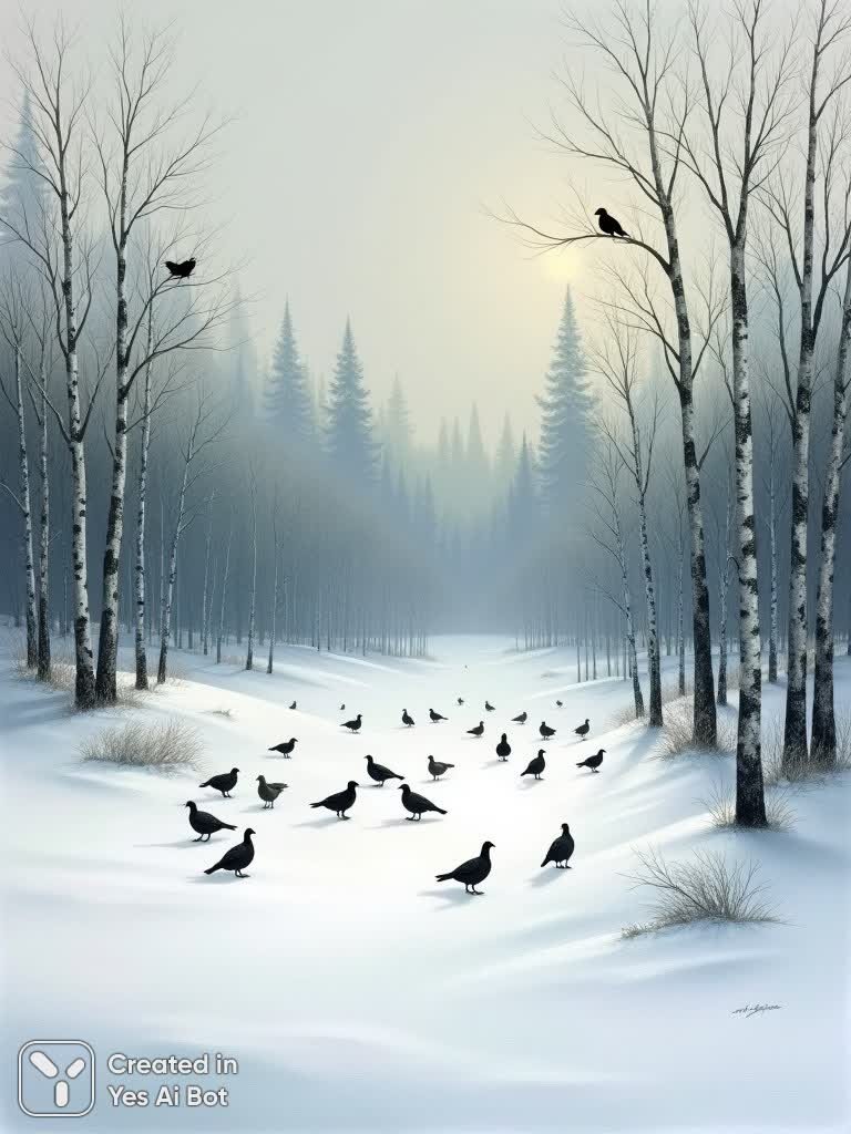 A winter landscape depicting a snow-covered forest. In the foreground is a snow-covered clearing dotted with flocks of dark birds, black grouse, scattered across the white expanse. In the middle ground are several bare trees with dark branches, on whose upper branches birds are perched. In the background is a dense forest covered with snow, with coniferous trees and slender birches, whose white trunks contrast with the muted tones of the sky. The snow is clean and untouched, reflecting soft, diffused light, creating subtle shadows and glare. The color palette is dominated by white, gray, and pale blue tones with shades of muted green in the b...