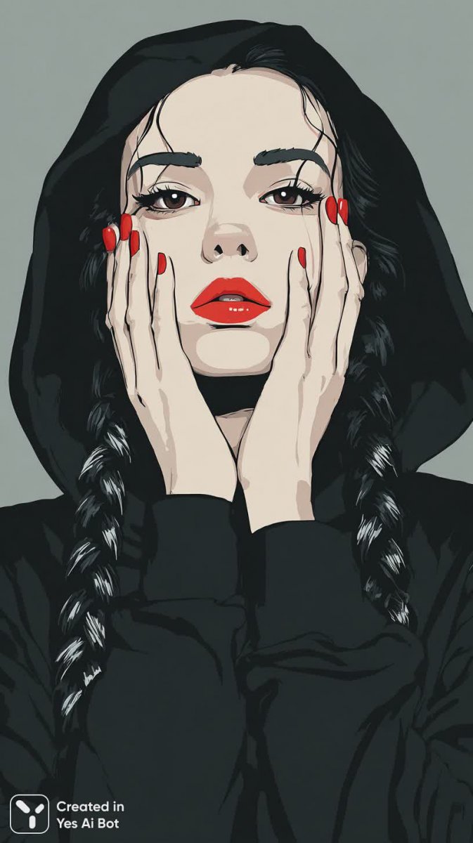Портрет молодой девушки в стиле поп-арт, выполненный с использованием минималистичной графики и ярких акцентов. Ее лицо обрамлено двумя длинными косами, сочетающими в себе черные и светлые оттенки, создавая эффектный контраст. Яркая красная помада подчеркивает чувственность образа, а темный худи добавляет нотку повседневности и расслабленности. Руками, деликатно обрамляющими лицо, девушка словно привлекает к себе внимание, приглашая зрителя заглянуть в ее внутренний мир. Фон выполнен в нейтральном сером цвете, что позволяет выделить яркие детали портрета и усилить его графичность. Особое внимание привлекают крупные красные ногти, добавляющие образу дерзости и уверенности. Выражение лица девушки – смелое и запоминающееся, сочетание силы и уязвимости, которое заставляет задуматься о ее характере и переживаниях. Простота композиции и яркие цвета делают этот портрет настоящим произведением искусства, воплощающим дух современной поп-культуры. В целом, работа передает энергию молодости, креативности и индивидуальности, выделяясь своей лаконичностью и выразительностью. Это визуальный гимн современному стилю и смелым решениям в мире моды и искусства, предлагающий зрителю насладиться гармонией формы и цвета