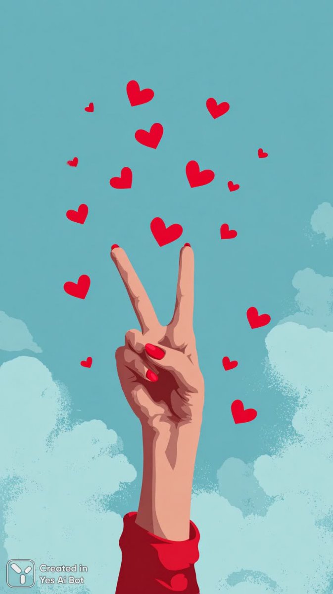 hand making peace sign, long red nails, surrounded by floating red hearts, minimal design, black background, vector style, simple yet striking, modern illustration, focus on visual contrast.