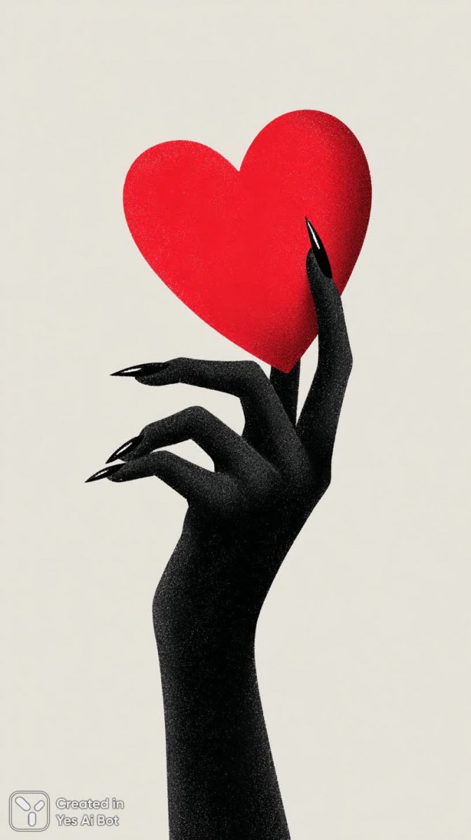 hand in black glove with long nails, holding bright red heart, minimalistic illustration, soft shadows, white background, modern design, clean lines, focus on red color, vector art style.