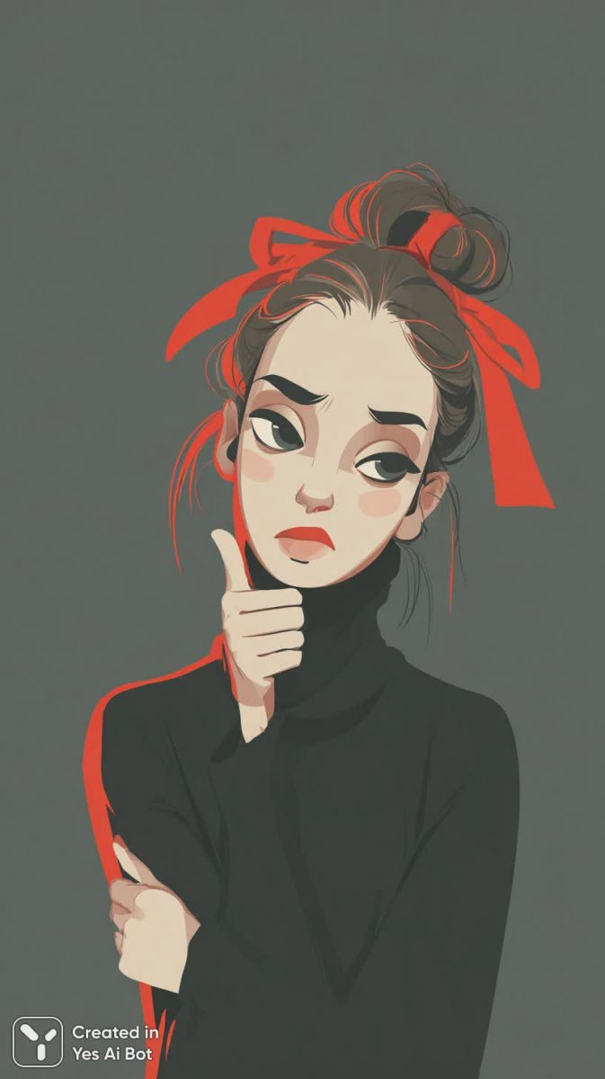 girl in black turtleneck, red ribbons on hair, thumbs up with love sign on thumb, gray-red background, comic style illustration, large expressive eyes, vibrant color accents, trendy graphic art.