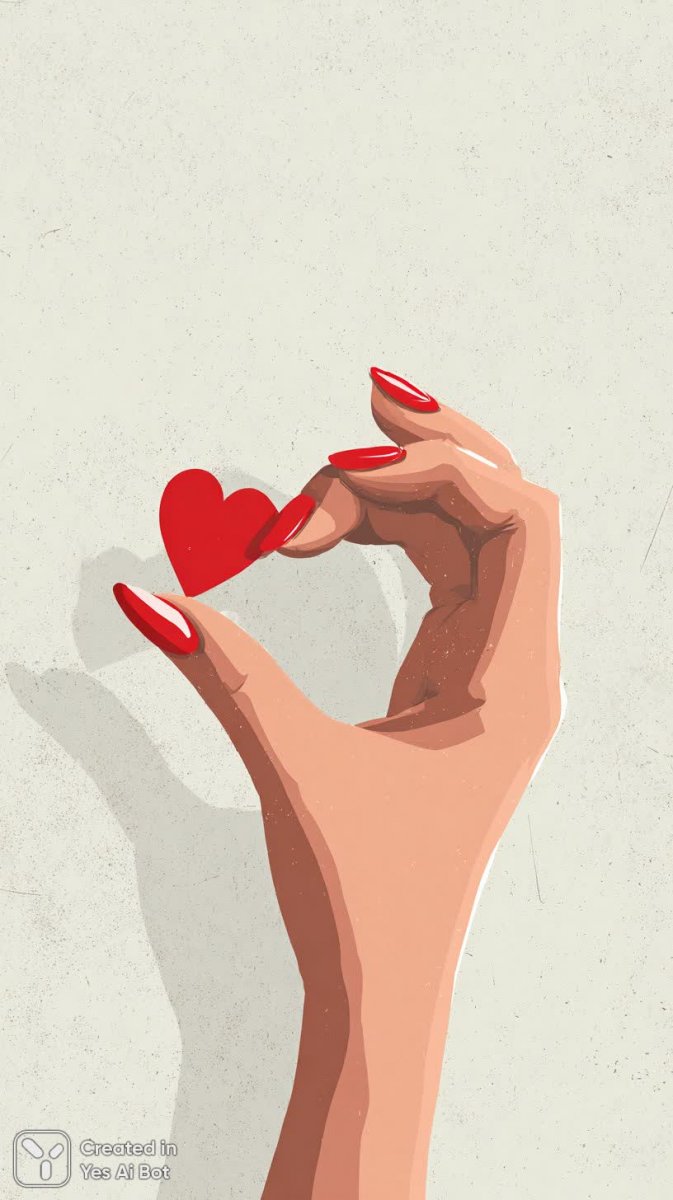 Изящная женская рука с длинными алыми ногтями создает символ любви – сердце. На руке надета элегантная черная перчатка, добавляющая образу утонченности и загадочности. Дизайн минималистичный, акцент сделан на гармоничном сочетании цветов и форм. Фон выполнен в виде текстурированной белой поверхности, создающей эффект глубины и объема. Современная иллюстрация в векторном стиле отличается четкостью линий и лаконичностью композиции. Контраст между насыщенным красным цветом ногтей и глубоким черным оттенком перчатки привлекает внимание и подчеркивает изысканность детали. Использование белого фона позволяет выделить ключевые элементы изображения, создавая эффект чистоты и ясности. Вся работа пронизана духом современности и элегантности, воплощая в себе идею любви и красоты с помощью простого, но выразительного визуального языка. Каждая деталь тщательно продумана для создания гармоничного и запоминающегося образа, который будет уместен в различных дизайнерских решениях – от иллюстраций до рекламных материалов
