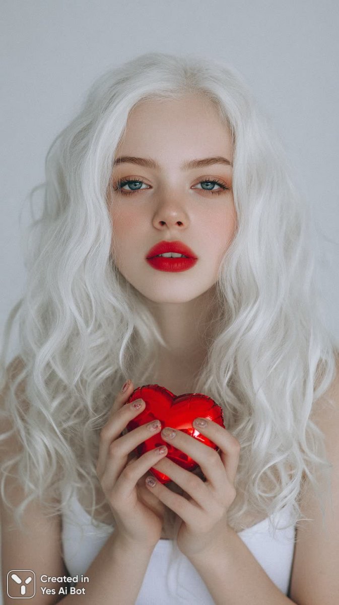 close-up of girl with long white wavy hair, red lips, and bright nails, holding red heart-shaped object near face, minimalist illumination style, neutral background, focus on accessories and expression.
