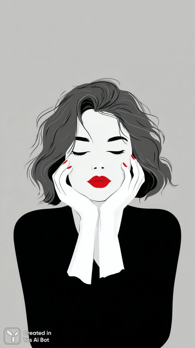 Игривый портрет девушки в стиле минимализма, выполненный в черно-белой гамме с яркими акцентами красного цвета. У нее короткая стрижка, губы и ногти выделяются насыщенным красным оттенком, а взгляд скрыт за большими круглыми солнцезащитными очками. Она нежно прислонила руки к щекам, создавая ощущение задумчивости и легкой кокетливости. Оверсайз силуэт одежды подчеркивает современный стиль, а выразительное лицо передает широкий спектр эмоций. Рисунок представляет собой векторную иллюстрацию с акцентом на детали и игру света и тени, что придает ему особую глубину и привлекательность. Фон – однотонный серый цвет, который позволяет выделить главную героиню и подчеркнуть ее индивидуальность, создавая гармоничный и запоминающийся образ. Это легкая и позитивная иллюстрация, наполненная энергией и оптимизмом