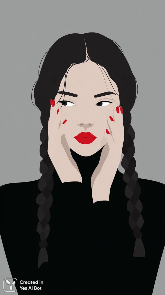 Портрет девушки в минималистичном графическом стиле завораживает своей лаконичностью и яркими акцентами. Длинные темные волосы заплетены в две аккуратные косы, обрамляющие лицо. Губы выделяются насыщенным красным цветом, а длинные ярко-красные ногти создают эффектный контраст с общей цветовой гаммой. Пальцы нежно касаются лица, подчеркивая его выразительность и добавляя портрету ощущение интимности. Девушка одета в черный водолазку, что создает нейтральный фон для насыщенного красного цвета. Фон выполнен в сером цвете, а мягкие тени придают изображению глубину и объем. Акцент сделан на красных деталях – губах и ногтях – которые притягивают взгляд и делают портрет запоминающимся. Вся композиция выдержана в строгом графическом ключе, что добавляет ей элегантности и современности. Это изображение – воплощение стиля и сдержанной сексуальности, где каждый элемент тщательно продуман для создания гармоничного и эстетически привлекательного образа. Насыщенность цвета и четкость линий делают этот портрет идеальным для использования в модных журналах или рекламных кампаниях, ориентированных на современную женскую аудиторию. Это взгляд, который не оставляет равнодушным, сочетающий в себе силу и утонченность