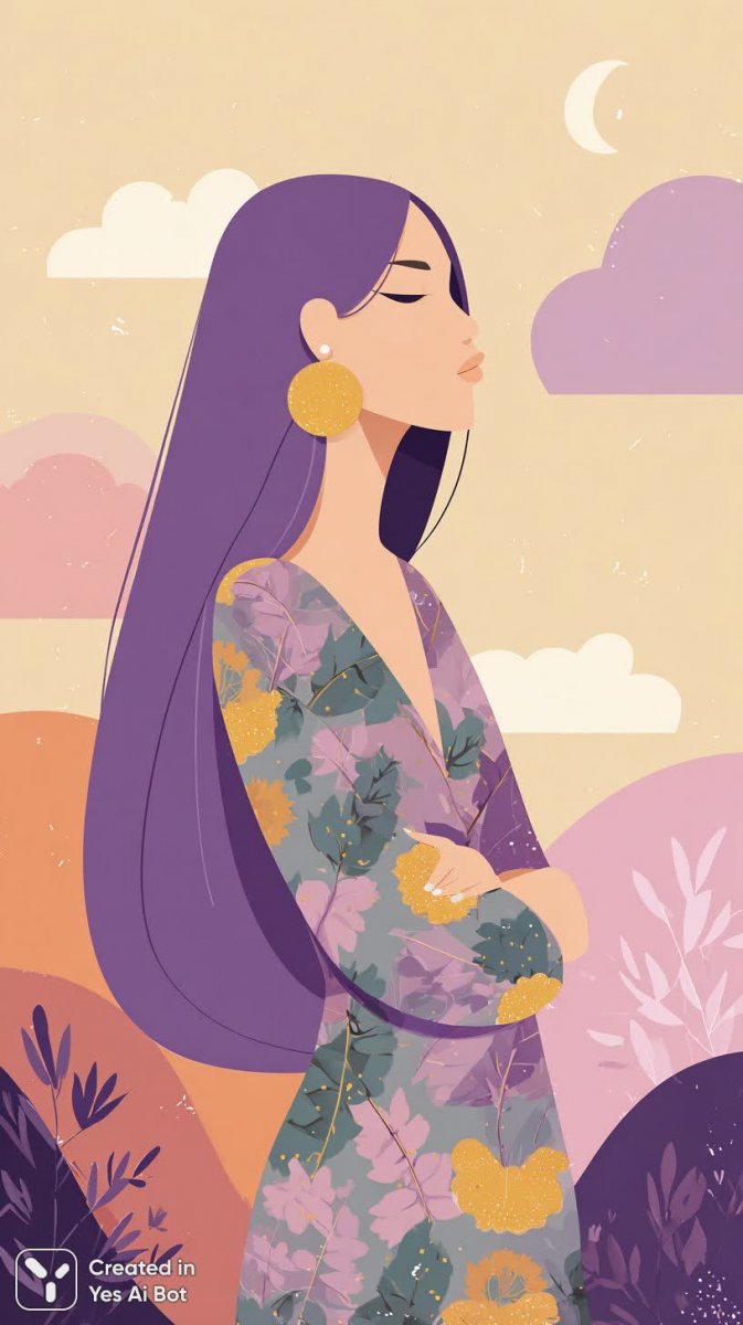 Изящная дама с длинными прямыми фиолетовыми волосами, запечатлённая в элегантном платье с цветочным принтом, дополненном крупными серьгами, находится в окружении геометрических фигур и ярких разноцветных облаков. Стиль иллюстрации выдержан в минималистичном ключе, преобладают нежные пастельные тона, создавая ощущение легкости и воздушности. Работа выполнена в технике плоского векторного изображения, характерной для стиля флэт дизайн. Вдохновение для создания данного произведения было почерпнуто из творчества Кёрстен Ульве, известной художницы, работающей в схожей эстетике. Композиция гармонично сочетает в себе элементы моды, искусства и дизайна, представляя собой стильное и современное визуальное решение. Вся картина пронизана атмосферой утончённости и изысканности, что делает её привлекательной для ценителей современного искусства и модных тенденций. Использование приглушённых оттенков и чётких линий придаёт изображению лаконичность и элегантность, а яркие акценты в виде геометрических фигур и облаков добавляют динамики и живости
