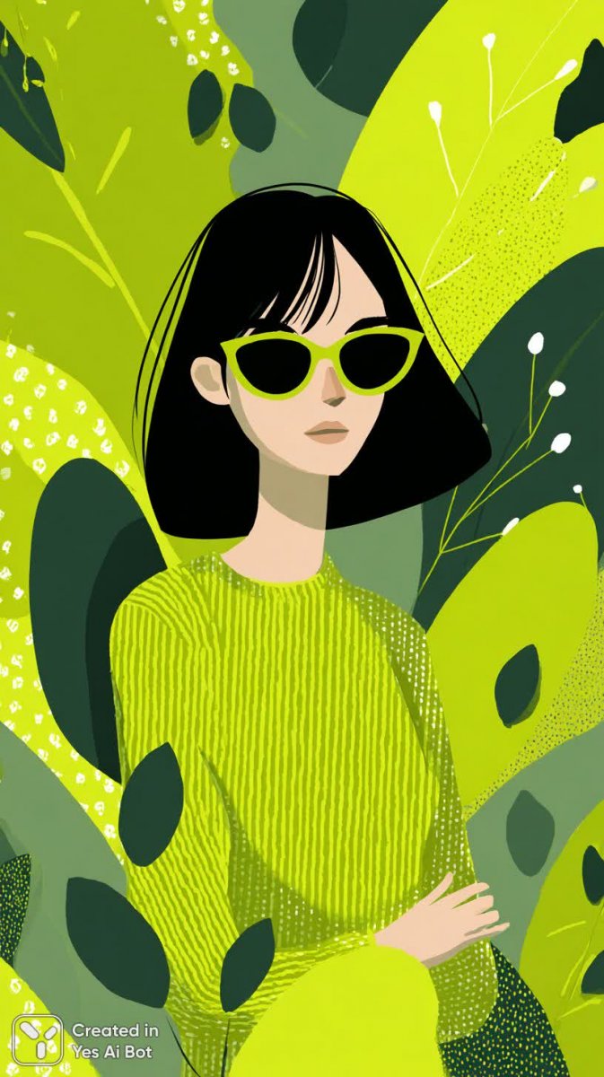 stylized girl with green skin and short black hair, wearing a neon-colored outfit, holding oversized sunglasses, surrounded by abstract palm leaves and geometric patterns, playful elements, vibrant colors, minimalist vector art, flat shapes, flat design, inspired by Kirsten Ulve.