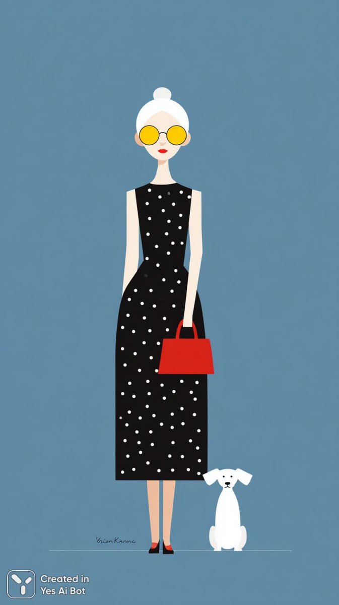 Элегантная высокая девушка в черно-белом полосатом платье уверенно шагает по абстрактному синему фону. Ее образ дополняют круглые солнцезащитные очки насыщенного желтого цвета и изящная красная сумочка, добавляющая яркий акцент к минималистичному стилю. Рядом с ней неторопливо прогуливается маленькая белая собачка, создавая ощущение спокойствия и гармонии. Композиция выполнена в технике минималистичного векторного искусства с использованием плоских форм и геометрических элементов. Яркие тона и лаконичность линий подчеркивают современный стиль изображения, вдохновленного творчеством Кристин Ульве. Вся работа отличается чистотой исполнения и вниманием к деталям, создавая ощущение простоты и изысканности одновременно. Это визуальное воплощение элегантности и минимализма, где каждая линия и цвет тщательно подобраны для создания гармоничной картины, передающей атмосферу уверенности и спокойствия. Изображение излучает позитивную энергию и современный стиль, идеально подходящее для различных дизайнерских проектов и иллюстраций. Контраст цветов и форм создает динамичный эффект, привлекающий внимание к центральному персонажу и ее маленькому компаньону