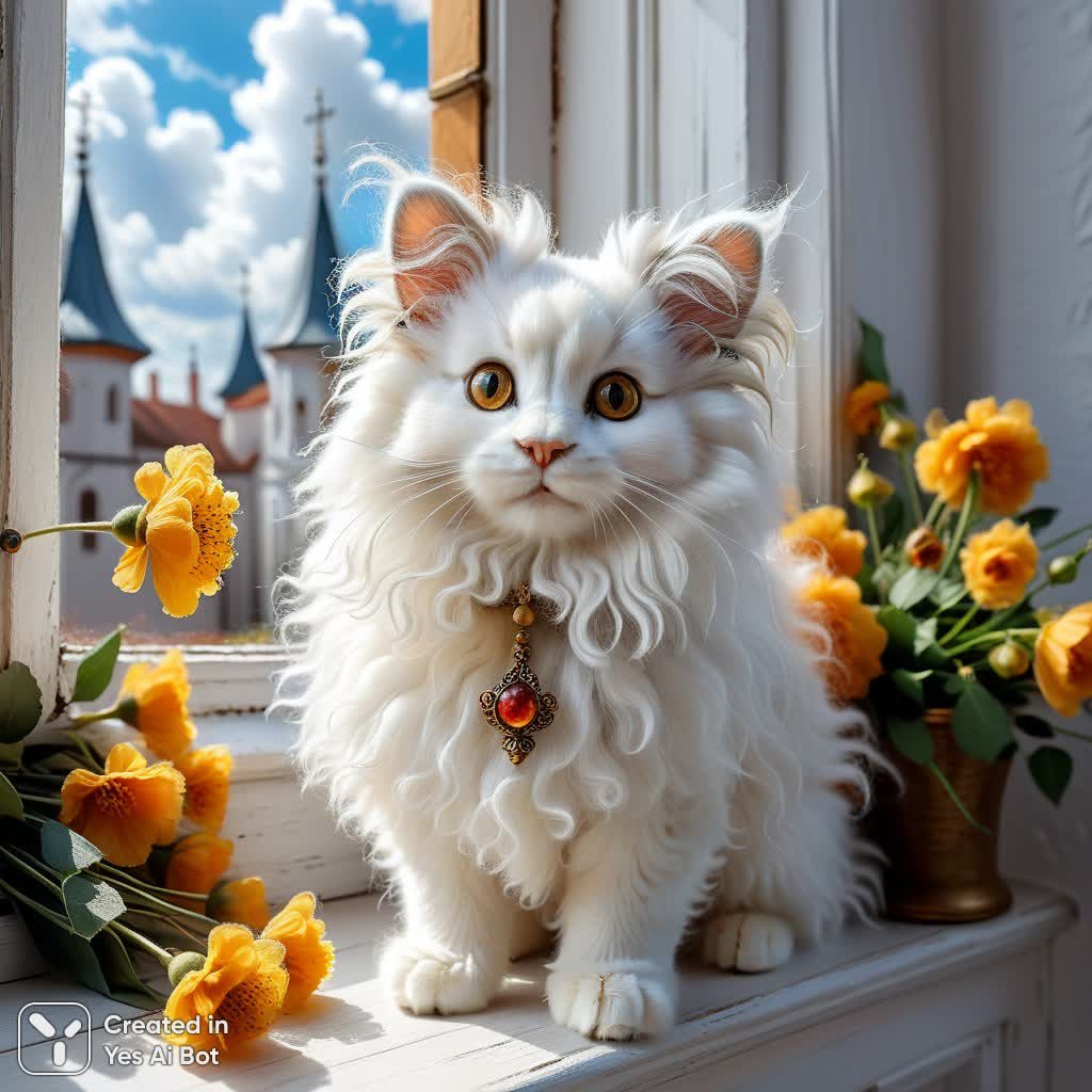 Невероятное сочетание нежности и игривости воплощено в этом изображении. Пушистый комок шерсти, сотканный из мягчайшего мохера и пуха, вызывает ощущение уюта и безмятежности. Его наивная мордашка с тонкими, слегка взъерошенными усиками, заканчивающимися едва заметным пушком, излучает чистоту и невинность. Мягкие, растрепанные волоски создают эффект легкости и воздушности, словно существо парит над белоснежным фоном. Изображение пронизано ощущением чуда – это настоящий волшебный персонаж, готовый подарить улыбку и хорошее настроение. Его лапки, украшенные букетом колокольчиков, добавляют композиции нотку игривости и беззаботности. Стиль, вдохновленный работами Бертона, Чувильева и Роба Скоттона, создает особую атмосферу сказочности и причудливости, а окно с видом на проплывающие облака добавляет ощущение волшебного путешествия в мир грез. Это не просто иллюстрация – это воплощение позитивных эмоций, наполненное юмором и добротой, способное согреть душу даже в самый пасмурный день. Кажется, будто этот пушистый друг готов отправиться на поиски приключений или просто поделиться своим теплом и лаской. Он излучает ауру умиротворения и радости, заставляя забыть о повседневных заботах и окунуться в мир фантазий