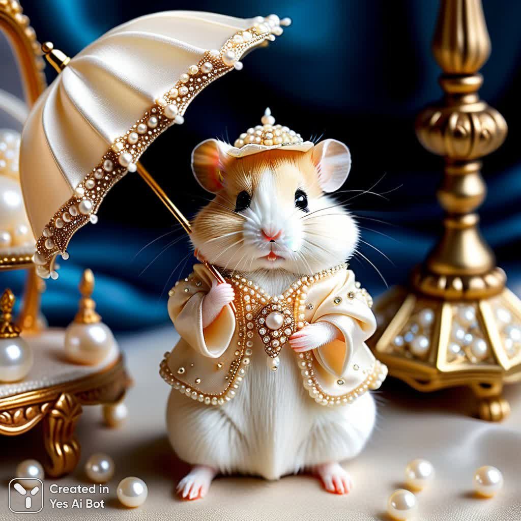 Adorable hamster dressed in a lavish, pearl-encrusted gown and hat. Creamy-beige fur on a small hamster. A full-length, lavish pearl-studded gown covers the hamster, meticulously crafted from large and small pearls. Matching pearl-studded hat is perched atop the hamster's head. The hamster is posed on a swing, feet in delicate pearl-embellished heels. The pose is playful and elegant. A miniature pearl umbrella completes the ensemble.