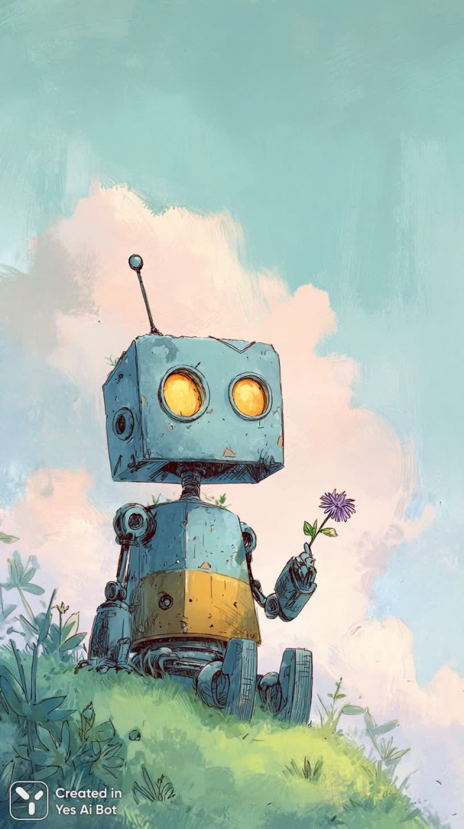 Невероятно детализированный рисунок чернилами изображает очаровательного робота с яркими сине-желтыми полосами. Он удобно устроился на живописном зеленом холме, словно наслаждаясь спокойствием окружающей природы. Голова робота имеет округлую форму и украшена двумя большими выразительными глазами, излучающими доброжелательность и любопытство. На верхушке головы располагается небольшая антенна, добавляющая образу игривости и футуристичности. В правой руке робот бережно держит нежный фиолетовый цветок, символизирующий надежду и красоту. Задний план выполнен в светлых пастельных тонах с мягкими пушистыми облаками, создающими ощущение легкости и безмятежности. Общая атмосфера рисунка наполнена причудливым настроением радости и оптимизма, вызывая у зрителя улыбку и желание окунуться в этот сказочный мир. Иллюстрация демонстрирует мастерство художника в передаче деталей и эмоций, создавая запоминающийся образ дружелюбного робота, гармонично сочетающегося с окружающей средой. Это произведение искусства – настоящий гимн позитиву и творческому воображению, способное вдохновить на новые свершения и радовать глаз своей красотой. Кажется, будто этот маленький робот пришел из далекой планеты, чтобы подарить нам частичку своего тепла и света