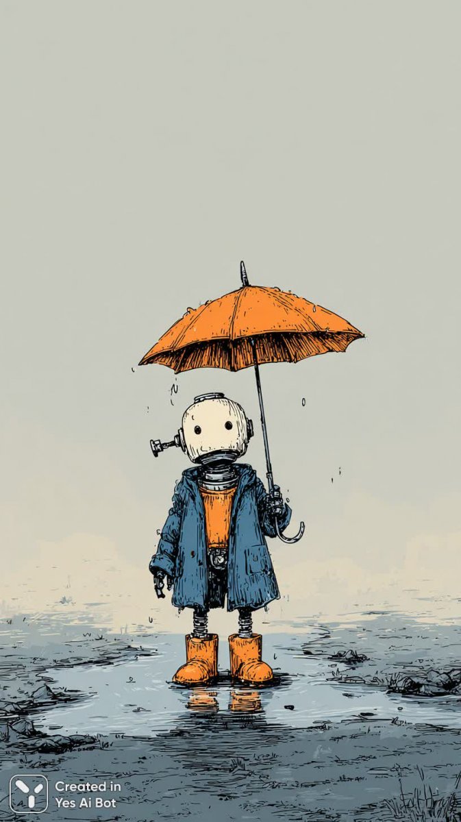 illustration, ink drawing of robot with a tiny umbrella, standing on a puddle, round head with two small holes, wearing a raincoat, bg rainy sky with dark clouds, whimsical and playful atmosphere.
