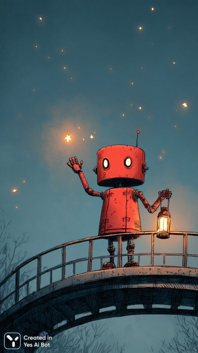Завораживающая цифровая иллюстрация, выполненная в технике чернильной графики, представляет собой образ могучего красного робота, уверенно стоящего на прочном металлическом мосту. Его округлая голова усыпана множеством крошечных отверстий, придающих ему загадочный и немного футуристический вид. Две мощные руки робота взметнулись вверх, словно в приветствии или же в выражении триумфа. В правой руке он держит старинный фонарь, освещающий путь сквозь надвигающуюся темноту. На заднем плане простирается сумеречное небо, постепенно усыпанное мерцающими звездами, что создает атмосферу приключений и надежды. Вся композиция пронизана ощущением движения и стремления к неизведанному, а яркий красный цвет робота контрастирует с приглушенными оттенками неба, усиливая драматический эффект изображения. Эта работа – не просто иллюстрация, это визуальная поэма о смелости, исследовании и вере в лучшее будущее, где даже механические создания могут испытывать чувства и стремиться к звездам. Детализированная прорисовка моста, текстура металла и игра света на корпусе робота демонстрируют мастерство художника и его внимание к мельчайшим деталям, делая это произведение искусства поистине захватывающим и запоминающимся
