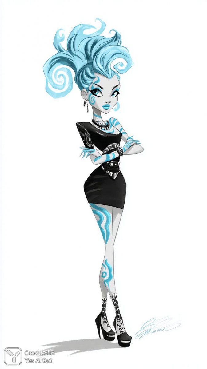 Яркая и дерзкая кукла Monster High в стиле гранж покоряет своей уверенностью. Изящный набросок чернилами демонстрирует смелый образ: электрически-голубые татуировки, контрастирующие с насыщенным синим цветом губ и волос. Черный стильный костюм подчеркнут острыми деталями и необычными узорами притягивает взгляд, а аксессуары добавляют образу неповторимости. Динамичные голубые татуировки, словно светящиеся изнутри, придают персонажу загадочность и игривость, усиливая ее сильный характер. Это не просто кукла – это воплощение бунтарского духа и яркой индивидуальности, сочетание моды и фантазии. Искусное исполнение подчеркивает детализацию и динамику изображения, создавая ощущение живого персонажа. Взгляд этой куклы пронизывает насквозь, обещая захватывающие приключения и неповторимые эмоции. Она – символ свободы самовыражения и смелости быть собой, настоящий фаворит среди поклонников Monster High и любителей альтернативной моды. Этот рисунок – прекрасный пример того, как можно сочетать классический стиль с современными трендами, создавая уникальный и запоминающийся образ