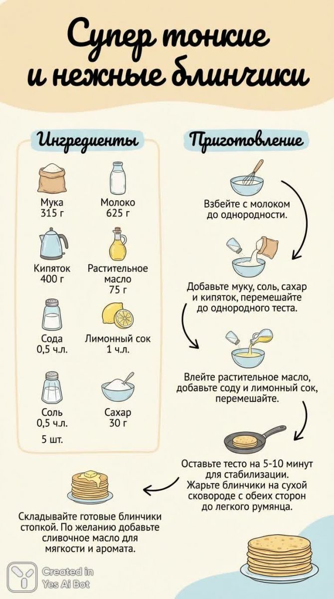 Идеальный рецепт нежнейших блинов, которые тают во рту! Эта инфографика раскрывает секреты приготовления супертонких блинчиков – воздушных и невероятно вкусных. Вам понадобится всего лишь несколько простых ингредиентов: яйца, мука, молоко, кипяток, растительное масло, сода, лимонный сок, соль и сахар. Подробная пошаговая инструкция поможет даже начинающему кулинару легко справиться с процессом приготовления теста и жарки идеальных блинов. Секрет заключается в добавлении кипятка и стабилизации теста после смешивания – это обеспечивает тонкость и эластичность блинчиков. Готовые блины можно складывать стопкой и при желании смазывать сливочным маслом для дополнительной мягкости и восхитительного аромата. Побалуйте себя и своих близких этими легкими, воздушными и невероятно вкусными блинами – они станут отличным началом дня или прекрасным дополнением к чаепитию! Легко, быстро и безумно вкусно