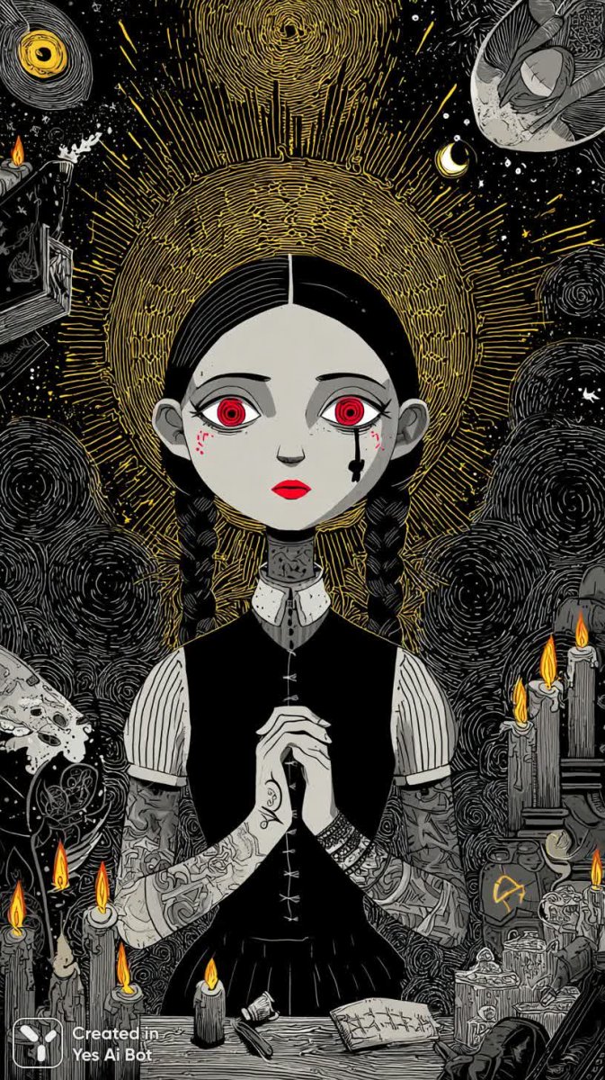Завораживающая иллюстрация в технике туши погружает зрителя в мир темной магии и мистики. В центре композиции – кукла вуду с яркими красными губами, облаченная в одежду в стиле нео-готика. Она стоит в эпицентре бурного вихря мрачной энергии, словно являясь его проводником или даже создателем. Яркие неоновые татуировки на теле куклы излучают жуткое свечение, подчеркивая сверхъестественную природу происходящего. Ритуал, который совершает кукла, разворачивается перед мерцающими свечами и древними артефактами, окутанными тайной и загадками. Внимание к деталям поражает – видны швы, скрепляющие куклу воедино, словно напоминая о ее искусственном происхождении. Особенно трогательным является изображение одинокой слезы, скатывающейся по нарисованному лицу куклы, добавляя в картину нотку грусти и человечности, несмотря на зловещую атмосферу. Эта иллюстрация – не просто изображение, а портал в альтернативную реальность, где переплетаются магия, искусство и эмоции, вызывая одновременно восхищение и легкий страх. Она заставляет задуматься о границах между жизнью и смертью, реальностью и вымыслом, искусством и сверхъестественным. Вся работа пронизана атмосферой таинственности и мистики, оставляя неизгладимое впечатление в памяти зрителя. Это визуальный рассказ о темных силах, ритуалах и хрупкости человеческой души