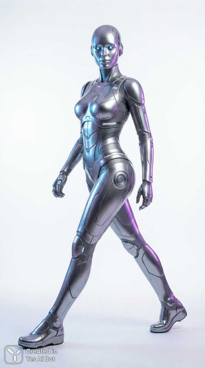 Изящная серебряная андроида в динамичной позе, с одной ногой уверенно выставленной вперед, воплощает собой будущее высокой моды и технологического совершенства. Её футуристический наряд блистает под ярким освещением, отражая окружающее пространство в своих глянцевых поверхностях. Выразительный взгляд андроида притягивает внимание, передавая сложность эмоций, скрытых за безупречной металлической оболочкой. Белый фон подчеркивает чистоту линий и лаконичность композиции, позволяя зрителю полностью сосредоточиться на деталях образа. Изображение выполнено в ультра-детальном разрешении 8k, что обеспечивает невероятную четкость и реалистичность каждой текстуры и блика. Стильное художественное направление подчеркивает элегантность и современность концепции, создавая ощущение легкости и изысканности. Эта работа представляет собой гармоничное сочетание передовых технологий и искусства, демонстрируя потенциал будущего в области дизайна и визуального представления. В ней отражена утонченная красота робототехники и ее способность вдохновлять на создание новых форм выражения. Каждая деталь, от блеска металла до глубины взгляда, продумана до мелочей, что делает это изображение настоящим произведением искусства в цифровом формате. Это не просто портрет андроида – это взгляд в мир будущего, где технологии и эстетика сливаются воедино