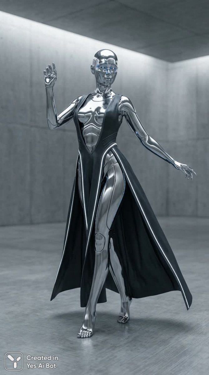 Воплощение элегантной кибернетической футуристичности – изящная девушка-киборг с телом из хромированного металла, плавными и тонкими линиями. Ее грациозная фигура застыла в статичной позе, руки слегка вытянуты вперед, создавая ощущение легкости и безмятежности. Фон минималистичен, словно акцентируя внимание исключительно на совершенстве формы и технологической изысканности. Мягкий, рассеянный свет подчеркивает блеск металла, придавая изображению глубину и объемность. Высокая детализация позволяет рассмотреть мельчайшие нюансы конструкции кибернетического тела, демонстрируя симбиоз человека и машины. Вся композиция пронизана эстетикой киберпанка, сочетая в себе элементы научной фантастики и антиутопии. Ракурс снят на уровне глаз, что создает ощущение непосредственного контакта со зрителем. Основной акцент сделан на женственных чертах лица и фигуры, подчеркивая красоту и утонченность даже в контексте технологического прогресса. Это не просто изображение – это манифест будущего, где технологии служат гармоничному сочетанию с естественной красотой и грацией. Киборг излучает уверенность и спокойствие, являясь воплощением идеального симбиоза человеческой сущности и передовых технологий, демонстрируя силу и хрупкость одновременно в мире, где грань между реальностью и фантазией стирается