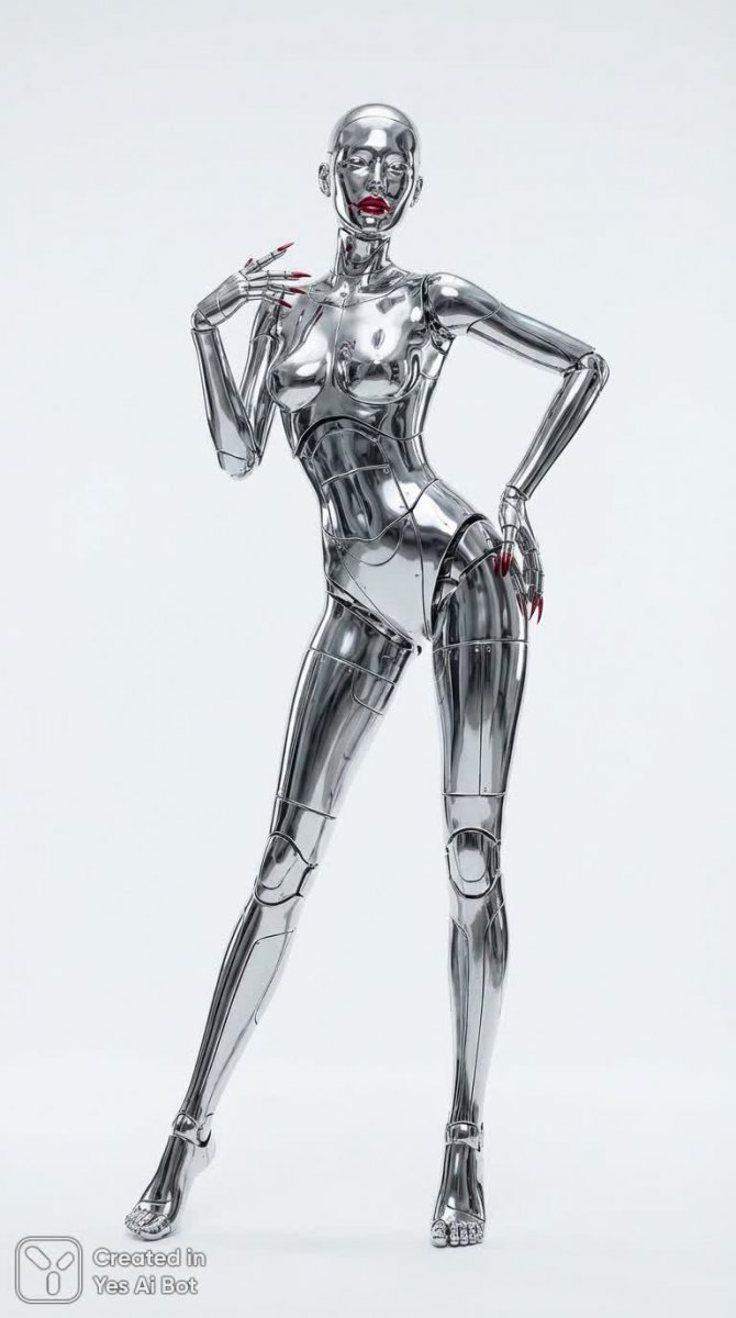Воплощение футуристической элегантности – завораживающая андроидная модель с вытянутыми пропорциями и безупречной внешностью. Ее высокий рост подчеркивает изящество удлиненных конечностей, создавая впечатление грациозной силы. Яркие, насыщенные рубиново-красные губы притягивают взгляд, словно символизируя смелость и уверенность в себе. Идеально ухоженные ногти демонстрируют внимание к деталям и безупречный стиль. Корпус андроида выполнен из хрома с футуристическим дизайном, отражающим передовые технологии и инновационный подход. Чистый белый фон позволяет полностью сосредоточиться на совершенстве формы и линий модели, а мягкое студийное освещение придает изображению глубину и объем. Четкие детали проработаны с исключительной тщательностью, позволяя рассмотреть каждую мелочь – от текстуры металла до изгибов тела. Динамичная артистичная поза передает ощущение движения и энергии, словно запечатленный момент творческого вдохновения. Высококачественное изображение обеспечивает максимальную четкость и детализацию, позволяя полностью погрузиться в мир будущего. Это не просто робот – это произведение искусства, сочетающее в себе красоту, технологию и инновационный дизайн. Изображение излучает атмосферу прогресса, элегантности и футуристической эстетики, представляя собой идеальный пример симбиоза человеческого творчества и передовых технологий