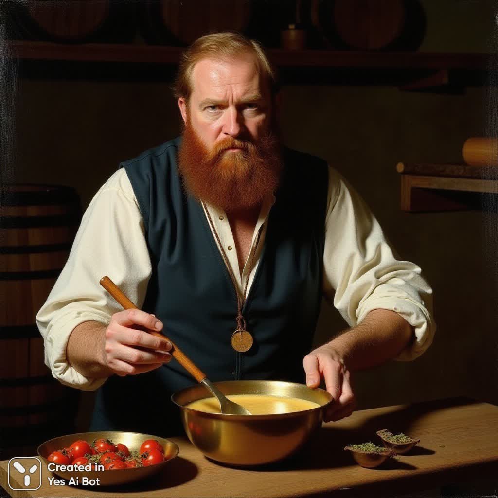 В полумраке уютной таверны или деревенской кухни запечатлен момент спокойного приготовления пищи. Мужчина средних лет с густой рыжевато-коричневой бородой и светлыми волосами, словно сошедший с полотен голландских мастеров Золотого века, внимательно смотрит на зрителя, слегка хмуря брови в сосредоточенности. Его взгляд пронизывает пространство, обещая тепло и сытность. Одет он просто: свободная белая льняная рубаха с подвернутыми рукавами, поверх которой надета темносиняя жилетка, добавляющая образу нотку практичности. Тонкий кожаный шнурок с небольшим кулоном едва заметен на его шее – деталь, намекающая на скромность и внутренний мир. В руках мужчины деревянная ложка, которой он неспешно помешивает густой кремовый суп в латунной миске. Эта простая задача кажется важной и значимой, словно сам процесс приготовления еды – это ритуал, наполненный смыслом. Рядом с большой миской стоит меньшая, наполненная сочными красными помидорами, щедро посыпанными зеленью или каким-то аппетитным гарниром. Фон картины погружен в полумрак, где угадываются деревянные бочки и полки – признаки старого таверны или просторной кухни. Игра света и тени создает теплую и уютную атмосферу, словно приглашая зрителя присоединиться к этому тихому моменту. Использование классической техники живописи маслом, с богатой цветовой палитрой и проработкой текстур, придает картине ощущение вневременности и реалистичности. Средний план съемки фокусирует внимание на человеке и его кулинарных занятиях, рассказывая историю о простом, но душевном угощении, которое согреет душу и тело в холодный вечер. Картина излучает спокойствие и умиротворение, передавая ценность простых радостей жизни