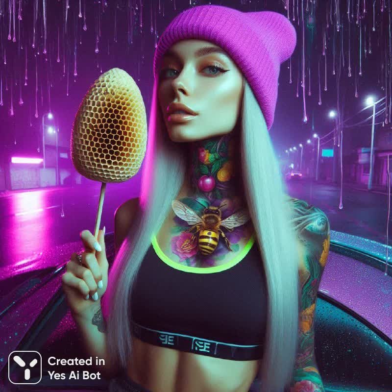 Сюрреалистичный портрет современной девушки, сотканный из контрастов и неожиданных образов. Нежный силуэт с бледной кожей и татуировкой в виде вишни на шее резко противопоставляется дерзкому киберпанк фону, украшенному повторяющимся мотивом спелой ягоды. В руках героини – необычный реквизит: огромное осиное гнездо, прикрепленное к палочке карамели, создающее ощущение хрупкости и опасности одновременно. Яркая неоновая шапка бини с принтом вишни акцентирует внимание на ее спортивной фигуре, подчеркнутой облегающим топом и лосинами. Взгляд привлекают темные губы, намекающие на легкий готический оттенок в образе. Фотография словно запечатлела мгновение из параллельной реальности, где красота и уязвимость сочетаются с бунтарством и загадочностью. Кажется, что снимок слегка размыт временем, как кадр со старой пленки, добавляя изображению ностальгическую дымку. Это визуальный гибрид нежности и агрессии, миловидности и андрогинности, создающий завораживающий эффект двойственности. Изображение излучает энергию молодости, смелости и готовности к экспериментам с самовыражением