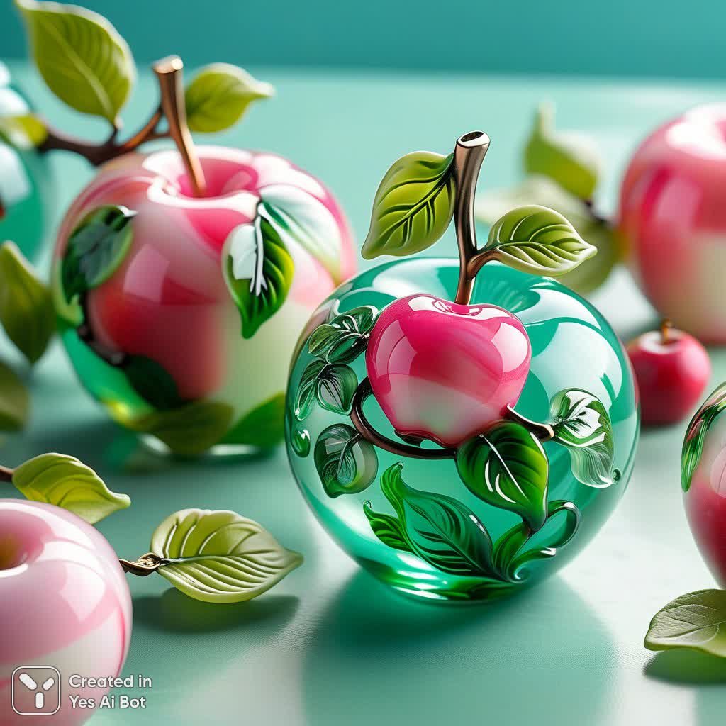 Лэмпворк,амальгама, цветная смальта, муранское стекло розовые яблоки с зелёными листиками на мятном фоне.